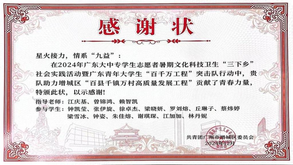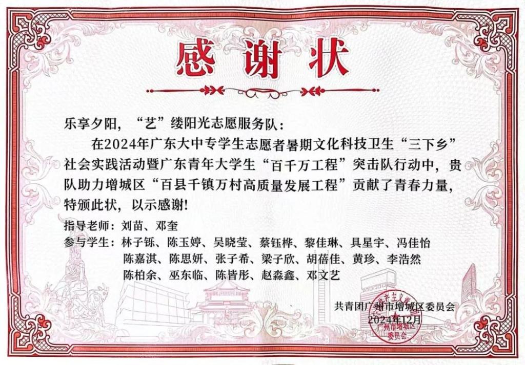 近日,3044永利集团登录教师教育学院组建的“星火接力,情系‘九益’”“点亮‘小楼’,暖心筑梦”“乐享夕阳,‘艺’缕阳光”三支社会实践队伍,因在增城区“百县千镇万村高质量发展工程”中表现突出,荣获共青团广州市增城区委员会颁发的感谢状。这是对教师教育学院学子践行社会责任、服务基层发展的充分肯定,彰显了华商学子在乡村振兴中的青春担当。