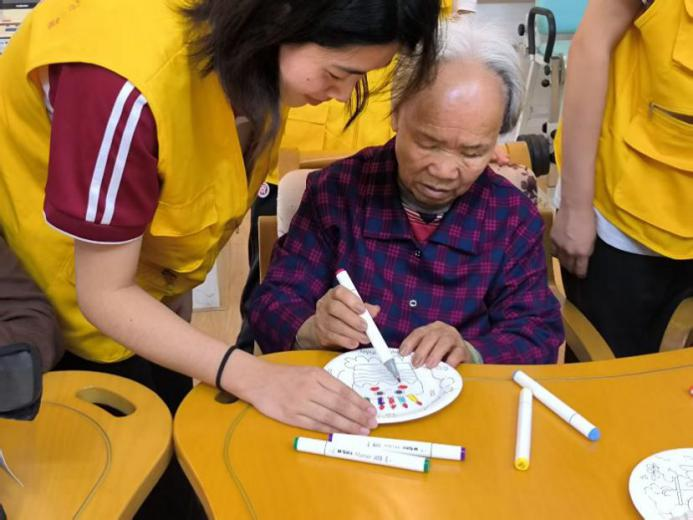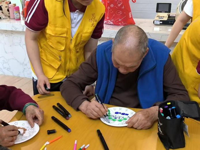 2025年4月14日,相隔一周,随着欢笑声从“锤”上延展到了“盘”上,盘子绘画活动如期开展。志愿者们耐心地介绍盘子绘画的游戏玩法、讲解绘画工具和操作方式。随后,在志愿者们的指导下,长者们拿起画笔,在白色的盘子上用彩色绘出风格各异的图案,专注地描绘着心中的美好。志愿者们和长者们交流着颜色搭配,分享彼此的故事和感受。
