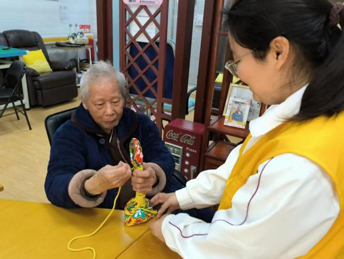 2025年4月7日,志愿者们耐心讲述艾草锤在传统民俗文化里的美好寓意及制作方法。活动中,在志愿者们的轻声鼓励、指导和帮助下,长者们弯折、包裹艾草,用棉线紧密缠绕着艾草包。大家相互交流经验,分享让艾草锤形状更饱满、造型更新颖的小窍门,现场满是欢声笑语与艾草清香。