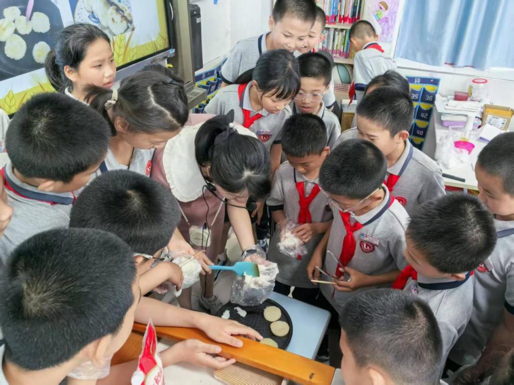 (跨学科学习活动展示课《有多少浪费本可避免》的课程现场,教师正在将学生制作的食物放入锅中煎制)