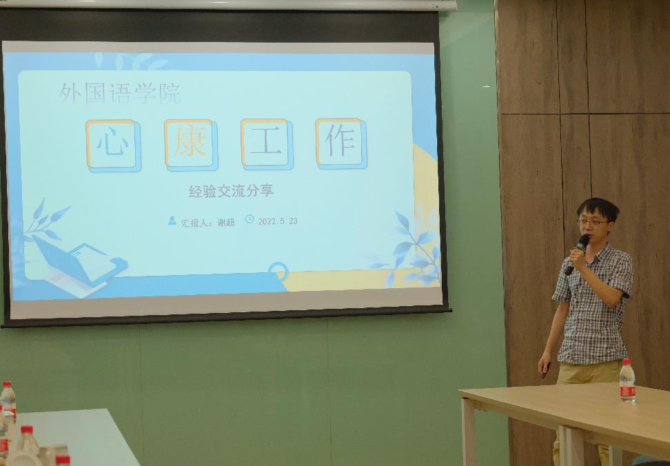 外国语学院代表谢超同志分享了心康工作经验。他认为学生组织心康站的建设主要包括活动的开展、公众号推文、心康干部培训、朋辈心理咨询等内容,重点关注对象的归档材料要遵守“归档及时、必要材料不可少、其他材料多方面考虑”的原则,心康的团队模式应该是一个三角关系,每一角都应该发挥它应有的作用。