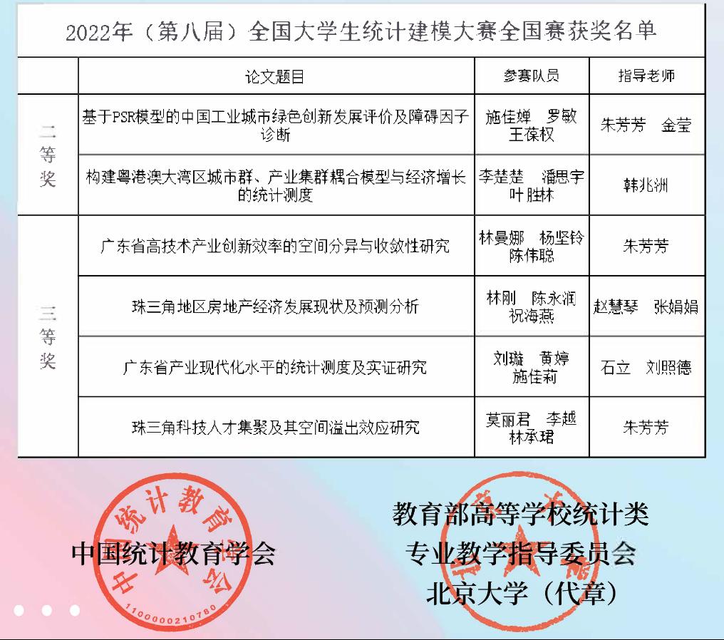 竞赛结果,广东省高校共获得27个奖项,是全国高校获奖最多的省份之一。27个奖项全部集中在8个高校之中,我校获国家二等奖2项,国家三等奖4项,总成绩位列广东省高校第三、广东省民办高校第一。其中:我校经济贸易学院朱芳芳副院长和金莹老师指导的施佳婵、罗敏、王葆权团队,韩兆洲副校长指导的李楚楚、潘思宇、叶胜林团队等2支队伍在此次比赛中获得国家二等奖。刘照德和石立、朱芳芳、赵慧琴老师等指导的4支队伍获得国家三等奖。
