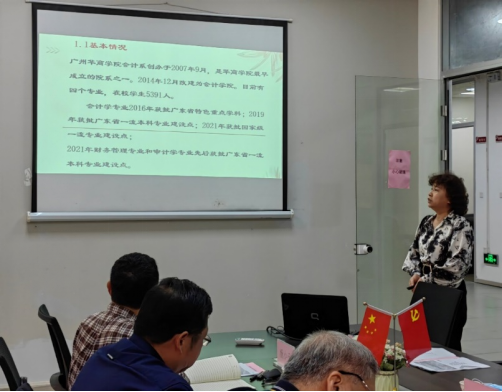 副院长刘善球教授主持了调研汇报会。副院长杨旻副教授分别从学院学科专业发展定位、人才培养特色、教师队伍建设、教学条件与利用、专业与课程建设、学风建设与学生指导、教学质量监督等方面汇报了会计学院本科教学工作的总体情况。