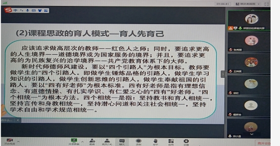 郑主任主要从“大思政”的内涵及理解、课程思政的育人模式“育人先育己”、课程思政的推荐方法及课程思政新教学模式四个方面分享了研修班的学习内容。一是,“大思政”的内涵及理解。“大思政课”是新时代加强和改进思想政治工作,提升人才培养能力的育人理念和工作方法;是深化课程思政,推进专业思政和学科思政的必然选择;是思政课、课程思政、日常思想政治工作同向同行,共同构建“大思政”工作格局内容、载体、途径的拓展与创新;为高校深化课程思政建设,健全“三全育人”体制机制,构建德智体美劳全面发展的高水平培养体系,落实立德树人根本任务提供了方法论指导。二是,课程思政的育人模式“育人先育己”。坚持教育者先受教育,多种途径提升教师思政水平和业务水平;高层次的教师“为红色人之师”;做严师,授课有自己风格,有信仰,用自己的正能量去影响学生;立志成为“大先生”,要以德立身、以德立学、以德施教。在课程思政工作中,教师要具有大格局、大智慧、大谋略。