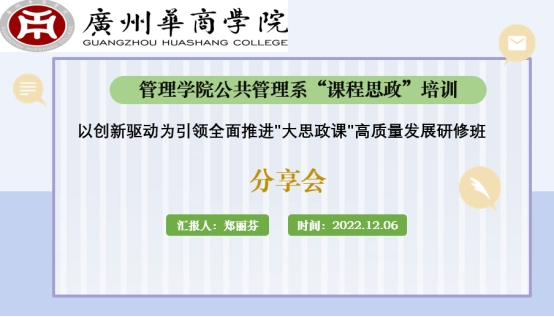 为深入学习贯彻党的二十大精神,推动“课程思政”建设更上新台阶,管理学院公共管理系于2022年12月6日下午6点以线上腾讯会议的方式举办了“以创新驱动为引领全面推进‘大思政课’高质量发展”培训成果分享会,公共管理系郑丽芬主任结合培训收获进行了会议分享,全体教师出席了本次会议。