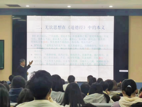 首先,李院长指出,当今世界是一个“物欲横流”的世界,也是一个普遍功利的社会,期望与两千多年前老子进行思想对话,探讨他的无欲思想对当代中国官员品行修养的价值,为当代官员修生养性提供中国传统文化思想方面的借鉴,也从中找出为当代中国大学生个人修养的思想启示。