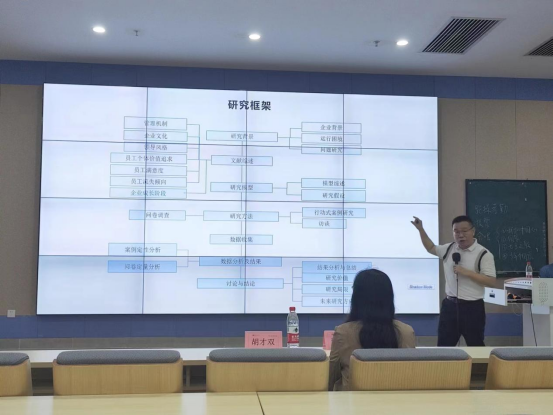 随后,胡老师讲授了有关中小民营企业管理机制方面的知识。通过具体案例,胡老师带领同学们分析相关员工体验感的数据,提出影响员工工作满意度和离职意愿的因素涉及企业经营的成熟度和精简度、企业文化、领导风格、员工价值等方面。一个企业要想在未来发展中留住人才,就要在不同阶段改革创新管理机制,这样才能提高员工的满意度,降低离职意愿。