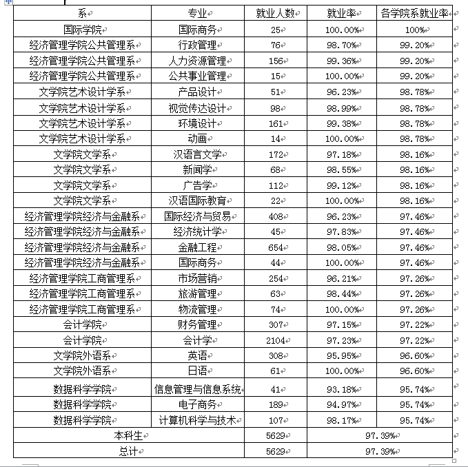 从表中看,学校2019届毕业生就业的专业对口率平均为71.62%。其中,我校2019届毕业生初次就业专业对口率在其所在院系中,文学院艺术设计学系专业对口率最高,为93.87%;其次是经济管理学院经济与金融系,为81.80%;再次是会计学院,为76.05%;专业对口率较低的为3044永利集团登录、数据科学学院、文学院外语系,分别为64.00%、49.48%、39.94%。