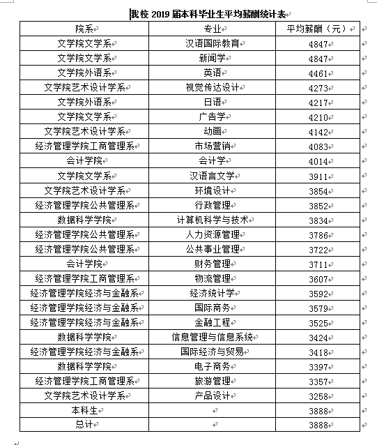 大学生就业在线院校应用系统中的数据显示,我校2019年毕业生的平均薪酬约为3888元,其中最高的是汉语国际教育和新闻学专业,平均薪酬4847元;其次是英语,为4461元;再次是视觉传达设计,为4273元。因为此项数据统计时间刚好为毕业生入职的实习期或者试用期,数据显示为毕业生的入职工资,比毕业生实际薪酬低。具体数据见下表。