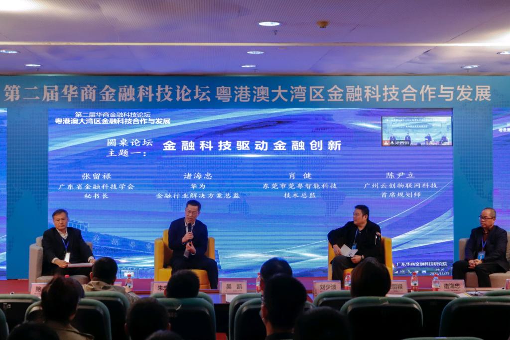 下午的会议包括了三个圆桌论坛。圆桌论坛一的讨论主题为“金融科技驱动金融创新”,讨论的嘉宾有广东省金融科技学会秘书长张留禄、华为金融行业解决方案总监诸海忠、广州云创物联网科技有限公司首席规划师陈尹立、东莞市莞粤智能科技有限公司技术总监肖健。张留禄教授分享了广州市黄浦区新出台的《金融科技十条》,指出金融科技现在发展的速度很快,应用面很广,研究也很深入。诸海忠回顾了金融科技和金融业务长期融合发展的过程,指出金融科技目前进入到智慧金融的阶段,手机、5G、互联网等技术的应用发展使整个行业现在处在一个人工智能爆发的前夜,我们国家会把过去几十年积累的技术应用于国产化替代,基于最新的一些业务需求,重新做一些梳理,进行变革,做一些重新的一个迭代和开发,这里面会迸发出来一个海量的需求。陈尹立认为在金融科技领域创新思路比技术更重要,元宇宙可以真正实现人和虚拟的彻底融合,甚至于植入芯片到人体内,现在可以把视觉万物互联,万物都有智能,都带着芯片。然后整个屏幕也可以任意切,跟现实交流,就以这么一个思路来实现,又能够给未来的元世界提供一个技术的研究,它必须具有安全性、低延迟、智能化沉浸式体验的特征。肖健分享了企业做智能制造、物流分拣、智慧医疗等业务的案例,指出技术对于产业的改造作用非常大。