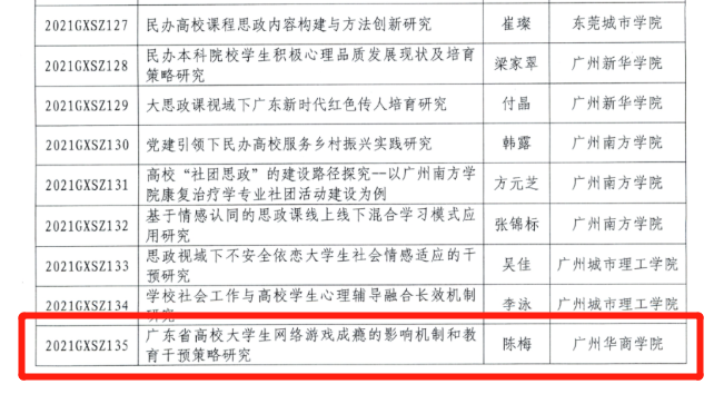 同时,广东省教育厅也公布2021年度高校思想政治教育课题和中小学德育课题立项名单,我校学生处陈梅老师申报的《广东省高校大学生网络游戏成瘾的影响机制和教育干预策略研究》(项目编号:2021GXSZ135)项目获批立项。