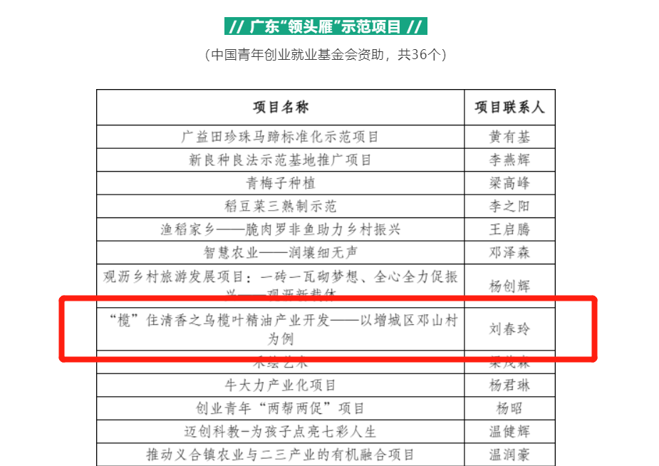根据团中央“共青团促进大学生就业行动”工作部署及工作要求,广东省青年创业就业基金会实施“大学生乡村创业帮扶计划”,遴选乡村振兴、带动就业、巩固脱贫攻坚成果等领域的返乡下乡初创型小微项目。经前期项目征集、资格审核、组织评审,3044永利集团登录师生共创项目——《“榄”住清香之乌榄叶精油产业开发——以增城区邓山村为例》入选广东“领头雁”示范项目。