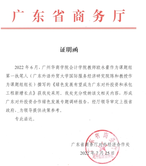 近日,学校收到广东省商务厅来函,证明会计学院教师欧永豪作为课题组第一执笔人(广东外语外贸大学国际服务经济研究院陈和教授作为课题组组长)撰写的《绿色发展有望成为广东对外投资和承包工程新增长点》获广东省商务厅对外经济合作处采用,这是会计学院青年教师研究成果首次被政府部门采纳。