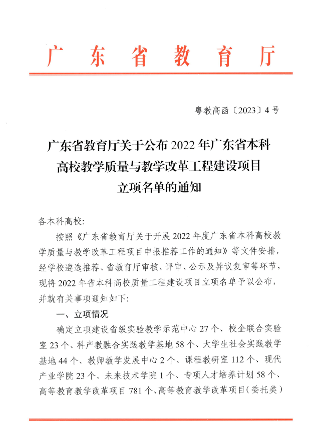 近日,广东省教育厅公布2022年广东省本科高校教学质量与教学改革工程建设项目立项名单。其中,我校获批立项7项,包括实验教学示范中心1项、大学生社会实践教学基地1项、课程教研室(虚拟教研室)1项以及高等教育教学改革项目4项。