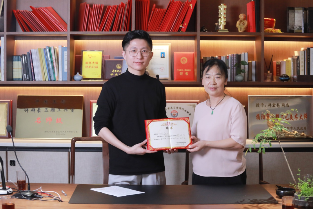 朱晓红院长为聚璟轩玉雕设计工作室颁发校外实践教学基地牌匾